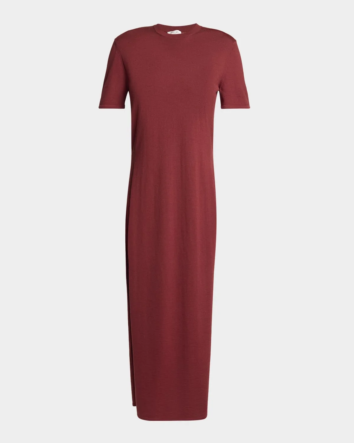 Saint Laurent dress is crafted from lightweight wool knit accented with thigh-high side slits Round neckline Short sleeves Sheath silhouette Ankle & nbsp;length Slipover style Wool Made in Italy
