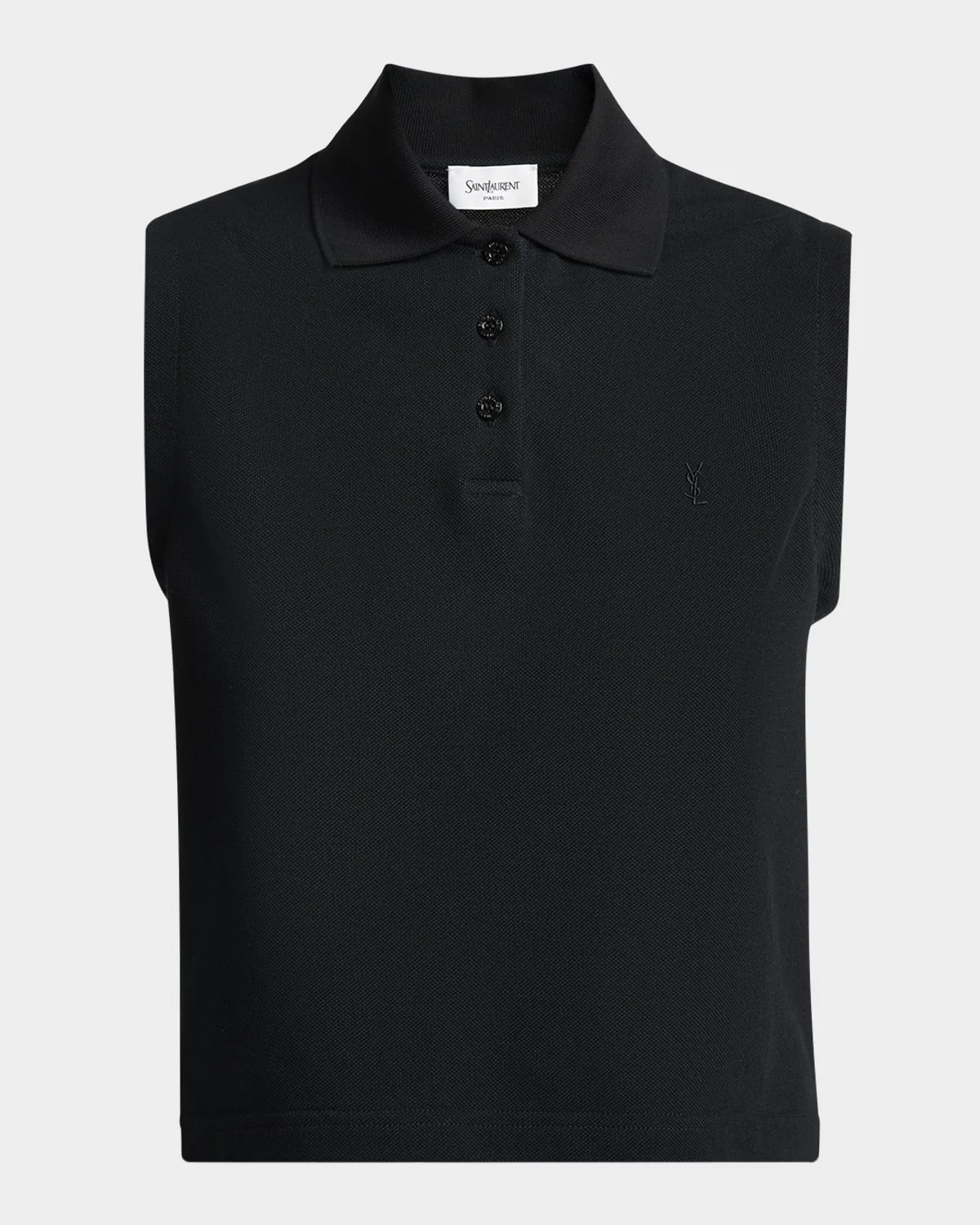 Saint Laurent polo shirt is crafted from cotton pique and accented with a signature YSL embroidered chest Spread collar; three-button front Sleeveless Relaxed fit Hip length Pullover style Cotton Made in Italy