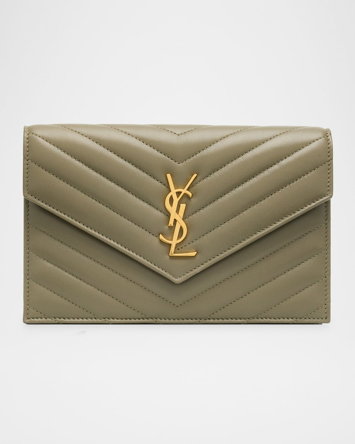- Saint Laurent wallet in quilted leather - Detachable chain shoulder strap - Can be worn as a wallet or shoulder bag - Features signature YSL logo lettering - Envelope flap top with snap closure - Interior, card slots and one zip pocket - Golden hardware - Approx. 4.9"H x 7.4"W x 1.3"D - Made in Italy
