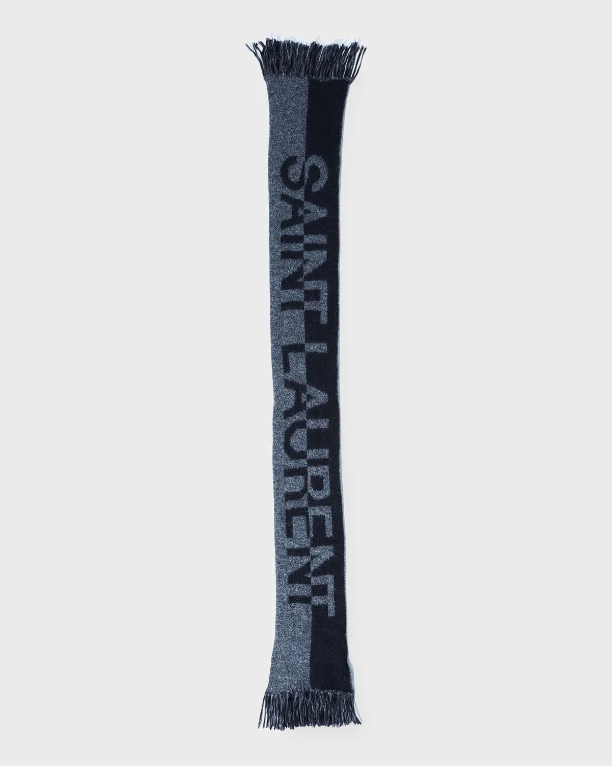 Saint Laurent scarf with split & nbsp;two-tone typographic & nbsp;logo May be styled multiple ways & nbsp; Fringe ends & nbsp; Wool Made in Italy