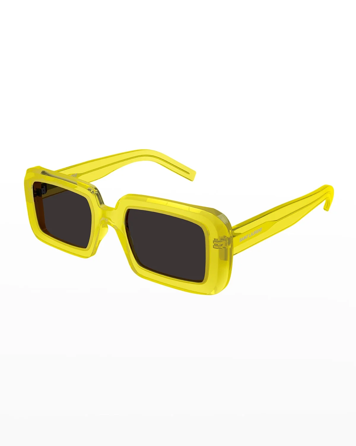 Saint Laurent "Sunrise" rectangle sunglasses in acetate Lens/bridge/temple (in mm): 5221145 Solidcolor lenses Logo print on temples Wide, tapered arms 100% UVA/UVB protection Made in Italy