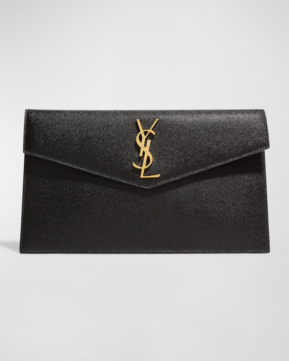 - Saint Laurent small pouch bag in powder-grain calf leather to carry as a clutch. - Envelope flap with magnetic closure. - Signature metal YSL hardware at center. - Golden hardware - Interior, one main compartment. - Fabric lining. - Approx. 6.2"H x 10.6"W x 0.7"D. - Made in Italy.