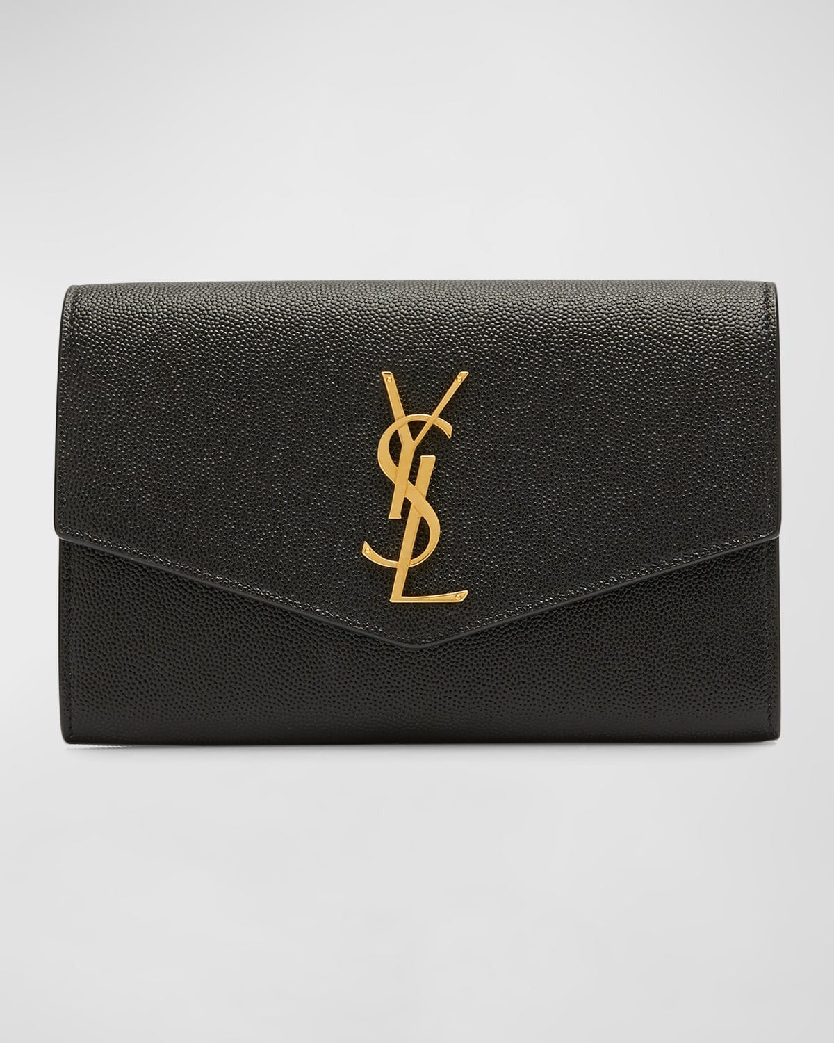 - Saint Laurent's Uptown bag is crafted of grained leather punctuated with signature YSL logo hardware. Made in Italy, this piece is accompanied by a dainty chain strap. - Saint Laurent wallet in powder-grain calf leather. - This wallet comes with a removable Fragment card case with three card slots. - Detachable chain shoulder strap, 18.8" drop. - Envelop flap with metal YSL monogram; snap closure. - Golden hardware - Interior slip pocket. - Approx. 4.7"H x 7.4"W x 1.1"D. - Made in Italy.