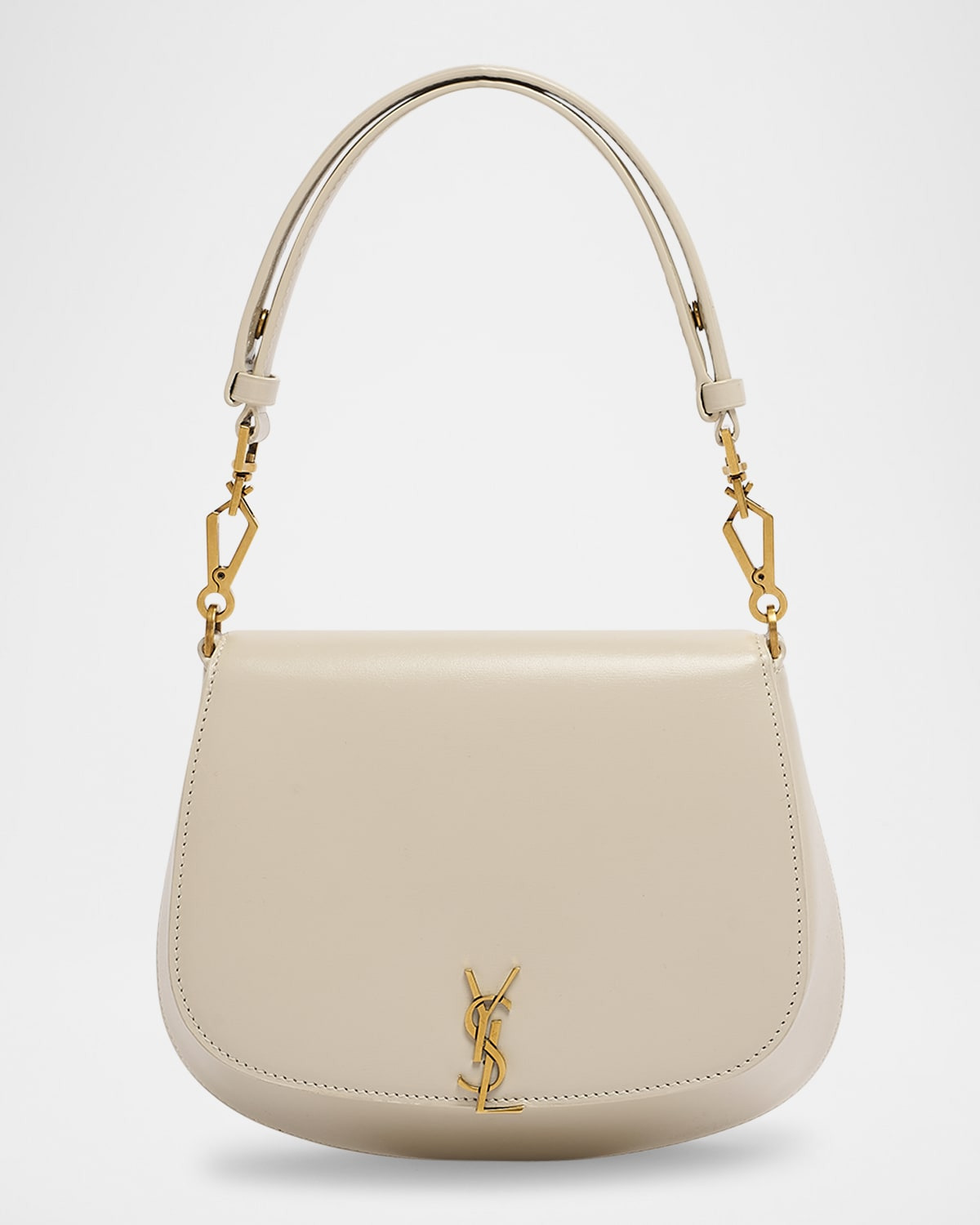 - Saint Laurent top handle bag in calfskin leather - Detachable, adjustable top handle - Flap top with magnetic closure; YSL logo lettering - Interior, one slip pocket - Golden hardware - Approx. 6.9"H x 8.3"W x 3.1"D - Professional cleaning recommended - Made in Italy - Proposition 65 warning for California residents