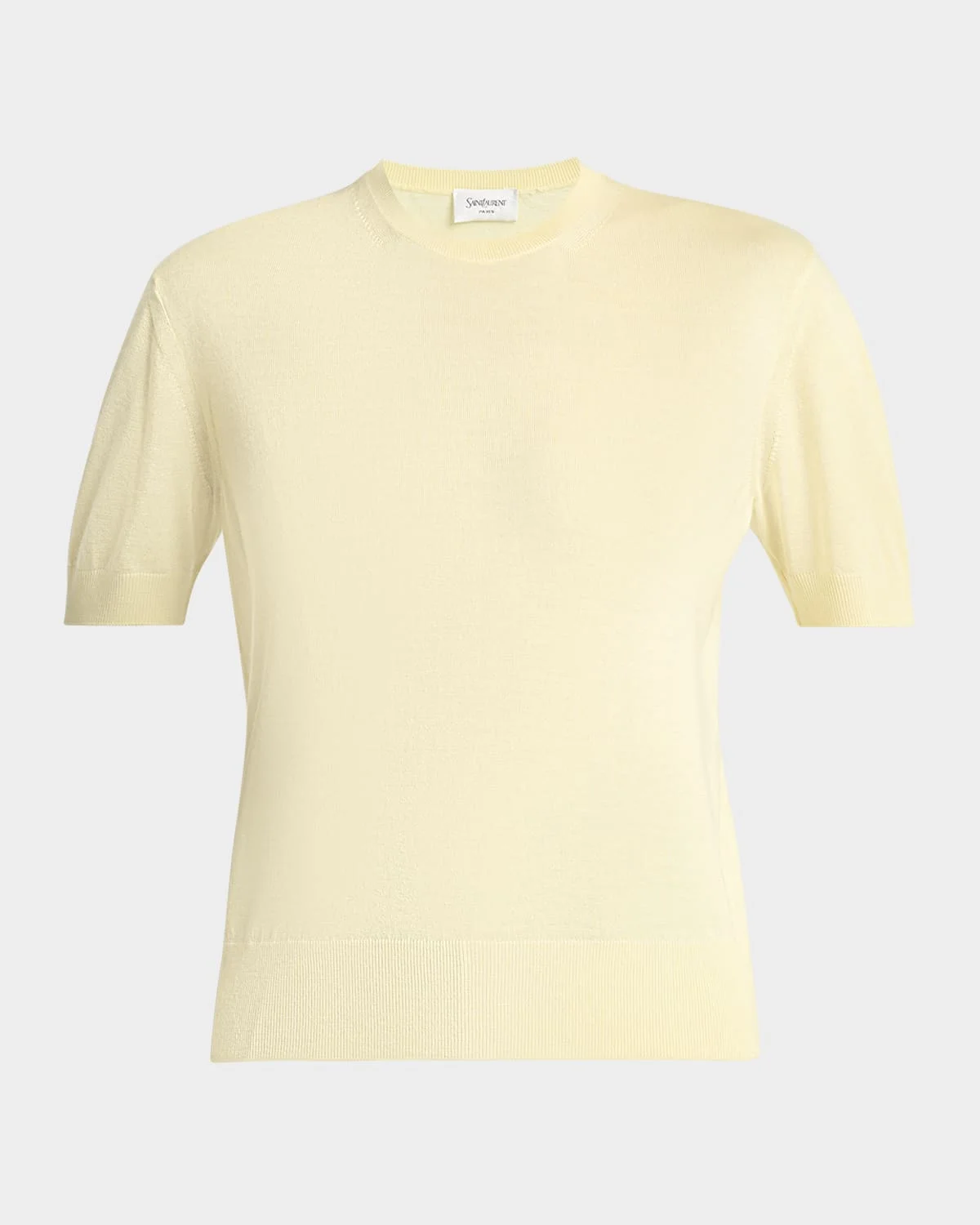 Saint Laurent top is crafted from cashmere blend & nbsp;knit accented with silk trim along the shoulders Crew neckline Short sleeves Relaxed fit Hip length Ribbed cuffs and hem Wool/cashmere/silk Made in Italy