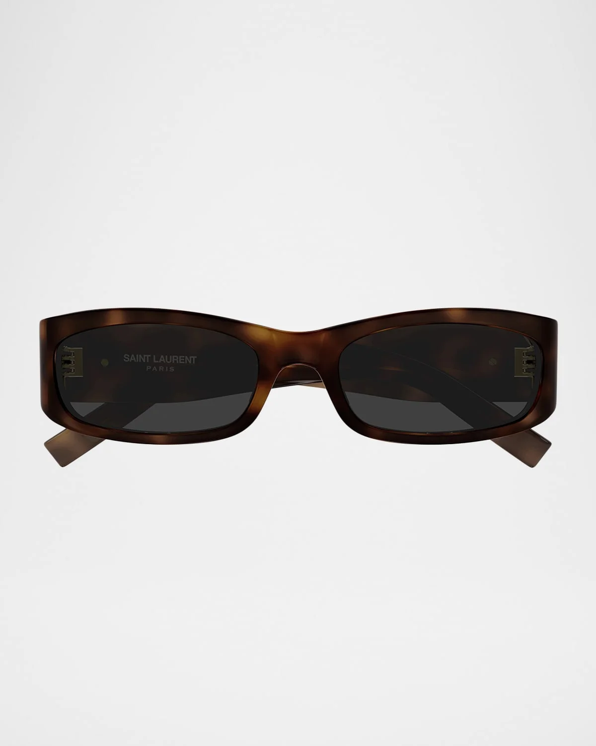 The "SL M152" acetate sunglasses by Saint Laurent feature the iconic Cassandre YSL logo at the hinges. Lens/bridge/temple (in mm): 5618130 Rectangular frames Solid lenses Fixed nose pads Wide, tapered arms Includes case and cleaning cloth 100% UVA/UVB protection Made in Italy