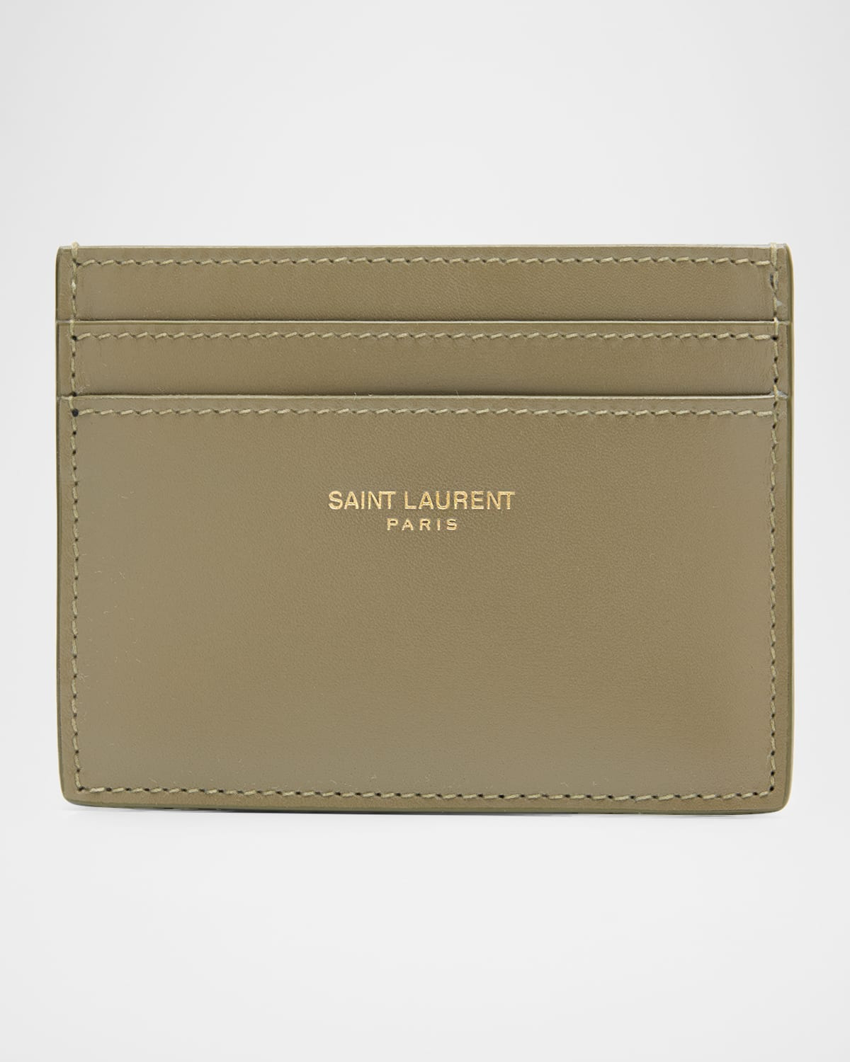 - Saint Laurent card case in calf leather - Features signature YSL logo lettering - Center card slot - Exterior, four card slots - Bronze hardware - Approx. 3"H x 4.1"W - Made in France