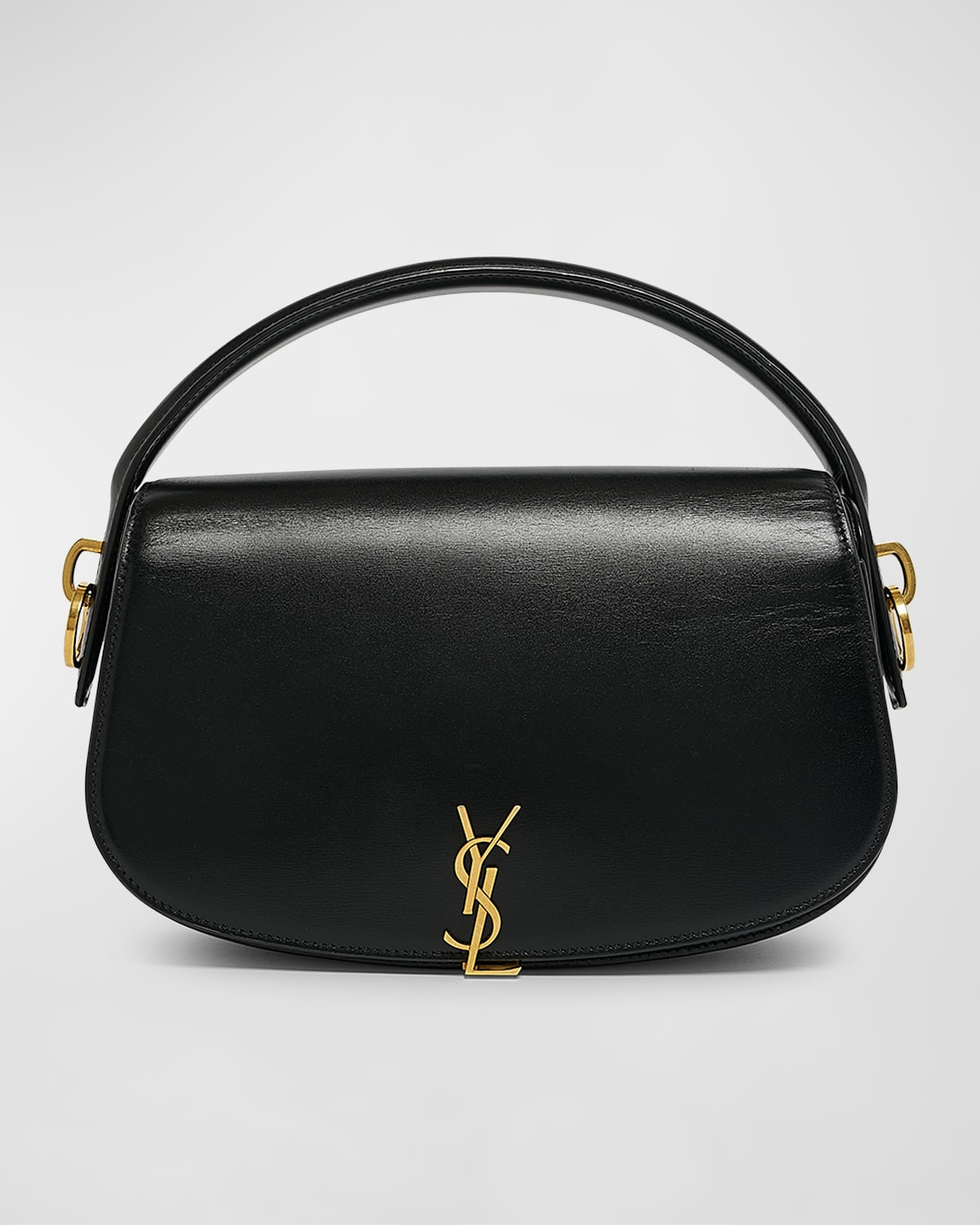 - Saint Laurent crossbody bag in smooth leather - Top handle - Detachable, adjustable crossbody strap - Can be worn as a top handle or crossbody bag - Flap top with YSL magnetic closure - Divided interior - Bronze hardware - Approx. 9.4"H x 5.9"W x 2"D - Made in Italy - Proposition 65 warning for California residents