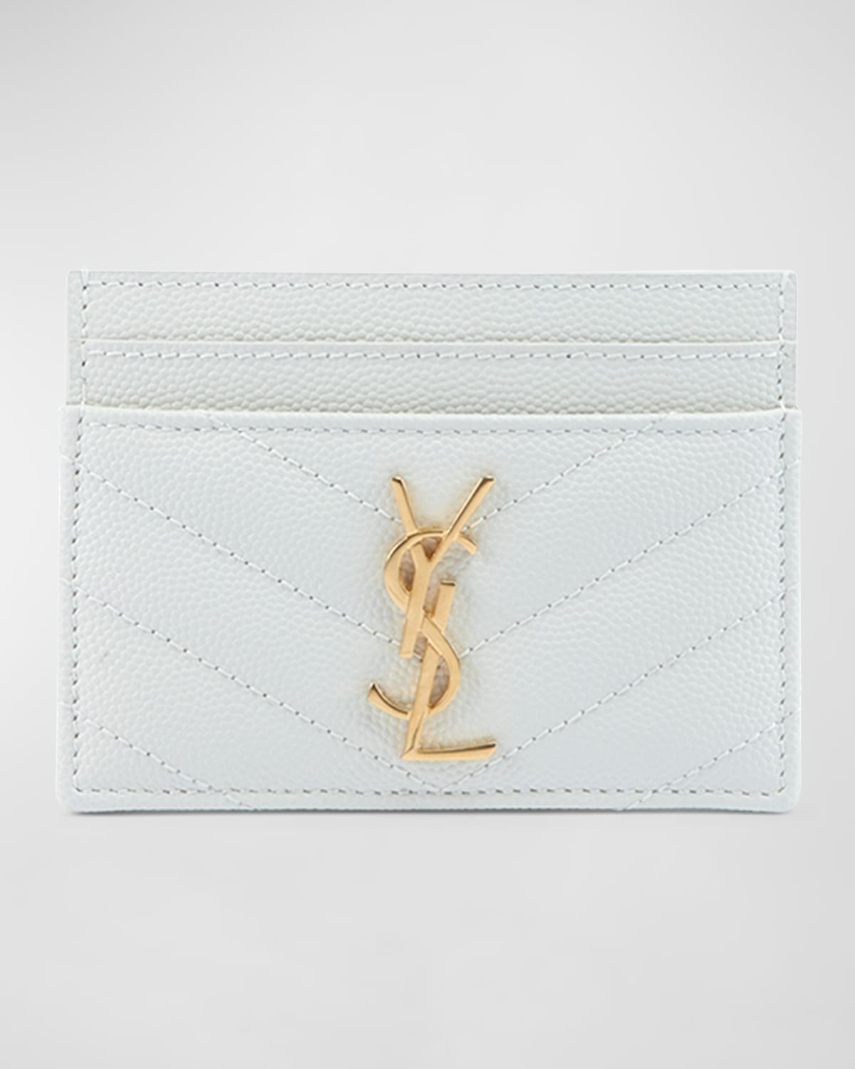 - Saint Laurent matelasse grained calfskin card case - Golden hardware - Four exterior card slots - Interior, slip compartment - 2.9"H x 4.1"W x 0.3"D; weighs 1.4 oz - "Monogramme" is made in Italy