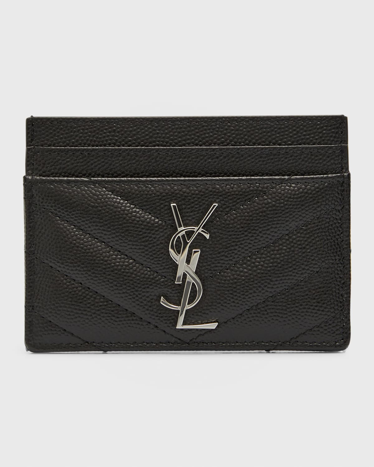 - Saint Laurent matelasse grained calfskin leather card case - Silvertone hardware - Four exterior card slots; interior slip compartment - 2.9"H x 4.1"W x 0.3"D; weighs 1.4 oz - "Monogramme" is made in Italy