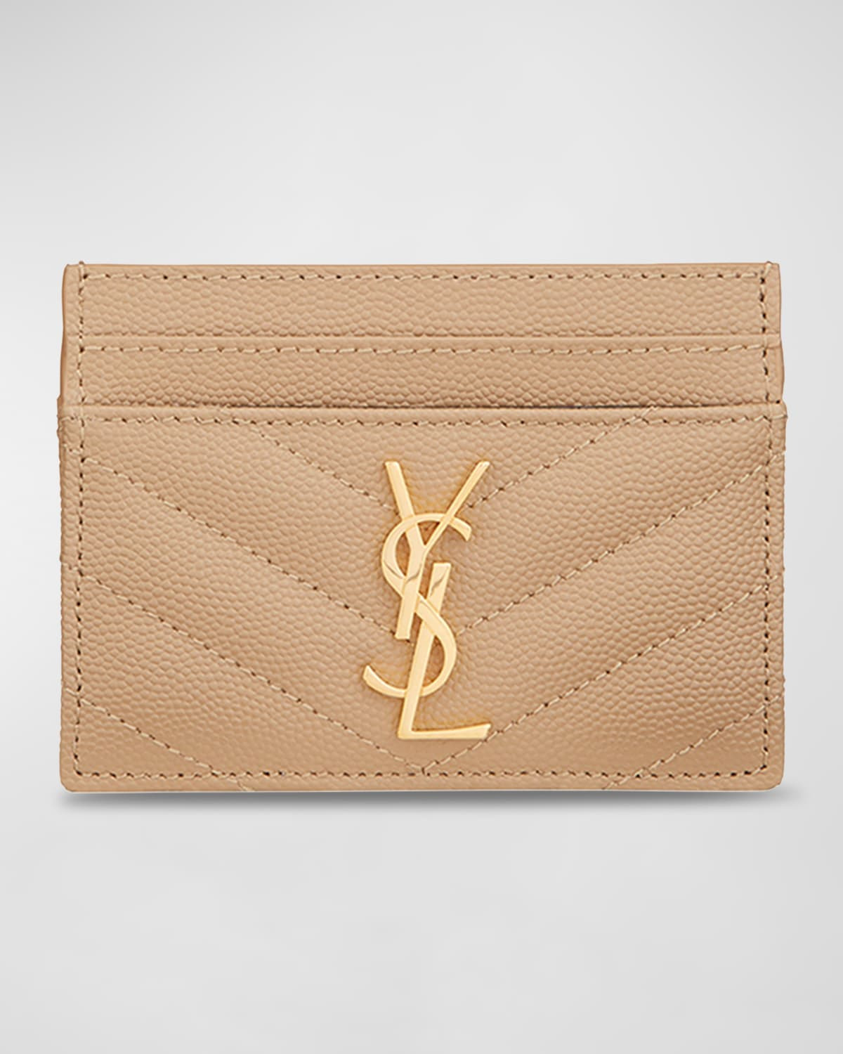- Saint Laurent matelasse grained calfskin card case - Golden hardware - Four exterior card slots - Interior, slip compartment - 2.9"H x 4.1"W x 0.3"D; weighs 1.4 oz - "Monogramme" is made in Italy