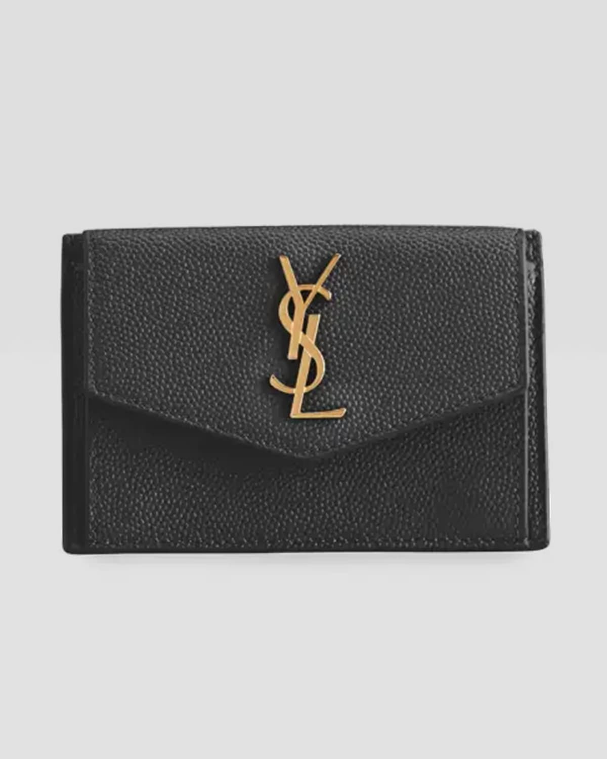 - Saint Laurent pebbled leather wallet. - Envelope flap top with snap closure. - Signature YSL hardware at front. - Golden hardware - Card slots at back. - Interior, coin pouch. - 2.7"H x 4.1"W x 0.2"D. - Made in Italy.