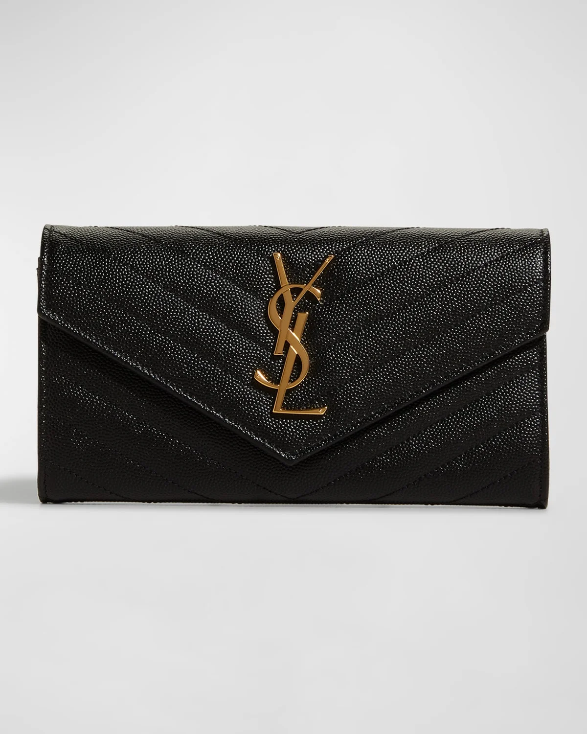 - Saint Laurent wallet in powder-grain calf leather with chevron topstitching - Golden hardware YSL logo lettering at front - Envelope flap top - Interior, twelve card slots, one coin pocket, two bill compartments, and two receipt compartments - Cotton lining - Approx. 4.3"H x 7.3"W x 1.1"D - Made in Italy