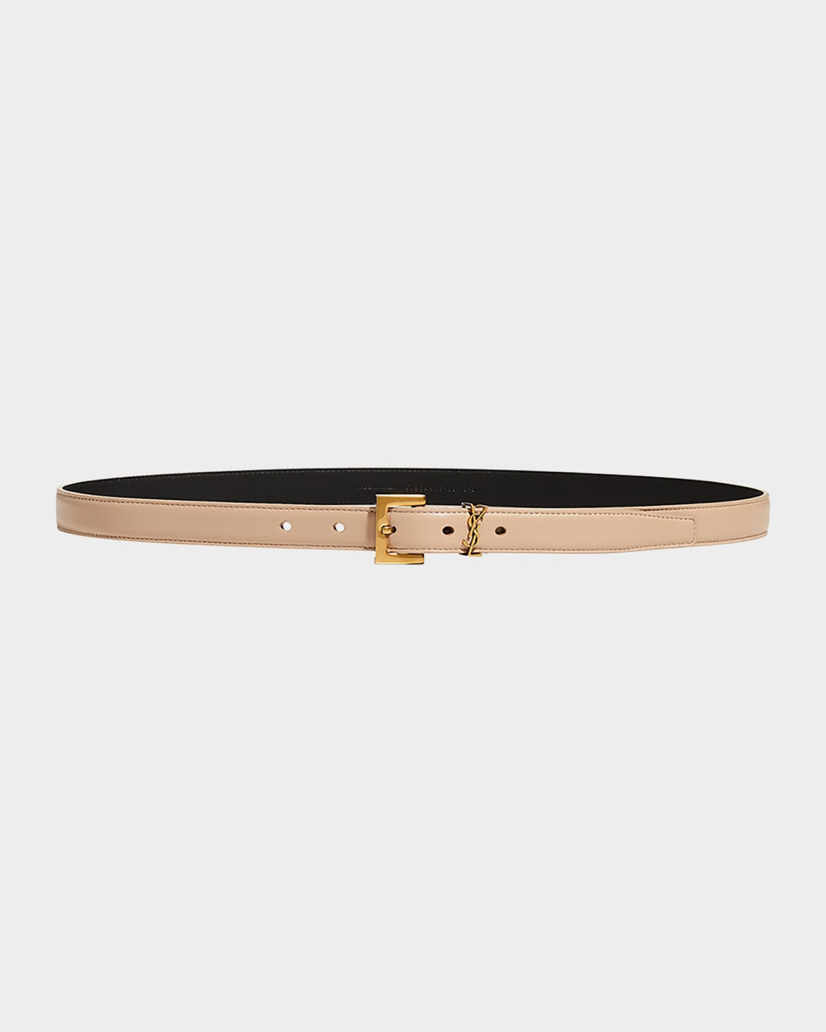 - SAINT LAURENT's belt is made from supple yet structured leather that'll age beautifully. It's detailed with silver 'YSL' hardware to match the buckle. The narrow shape is perfect for threading through loops of jeans or tailored pants. It's been made in Italy from soft leather and cut in a slim width that'll work well with skinny jeans. - Saint Laurent leather belt. - Metal YSL monogram detail. - Approx. 0.78"W (2cm). - Golden hardware. - Made in Italy. - Proposition 65 warning for California residents