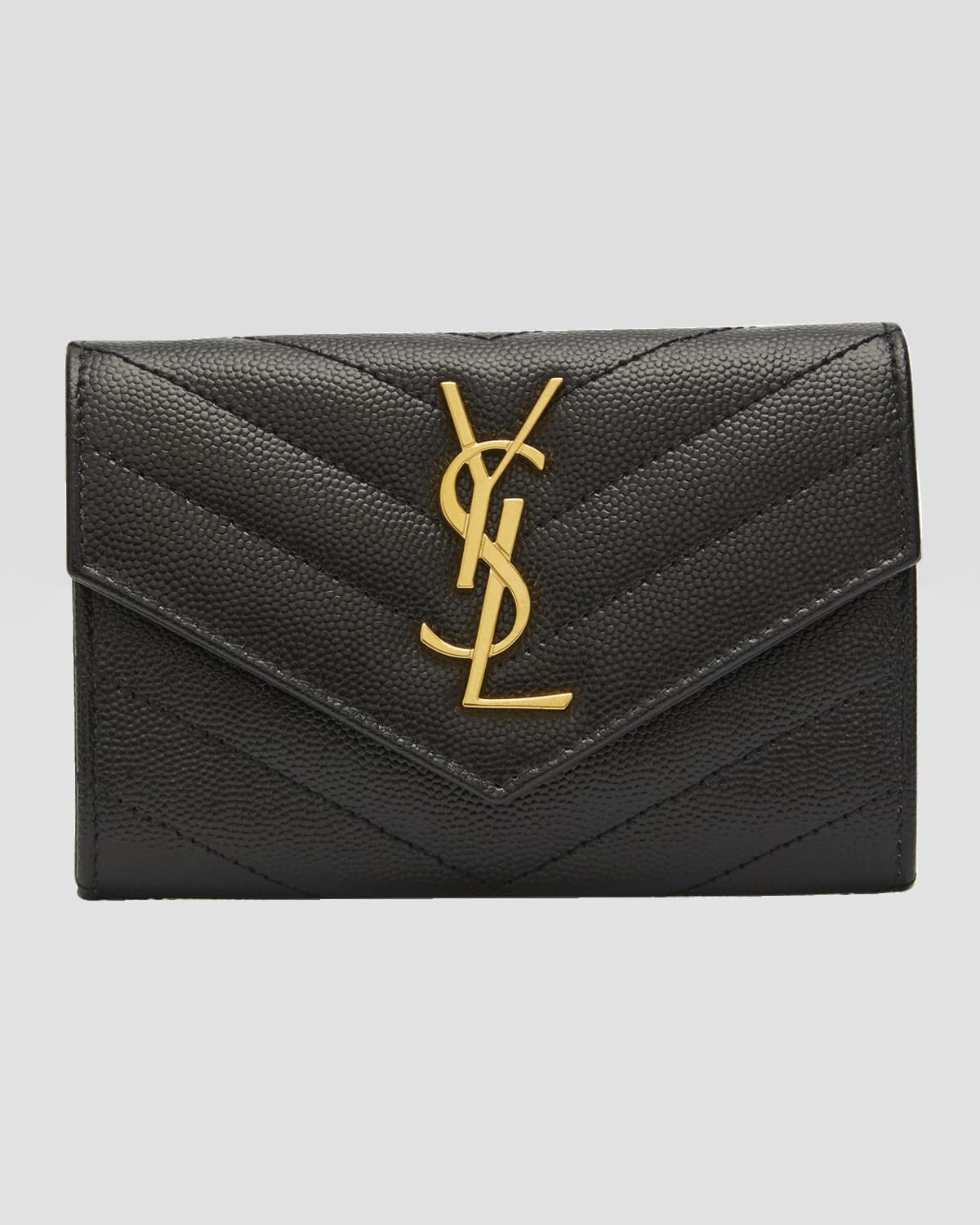 - Saint Laurent wallet in matelasse grained, chrome-metal-free tanned calfskin - Envelope flap top with YSL logo; snap closure - Exterior, back slip pocket - Golden hardware - Interior, four card slots and one open compartment - 3.7"H x 5.3"W x 1.2"D; weighs 3.9 oz - Made in Italy
