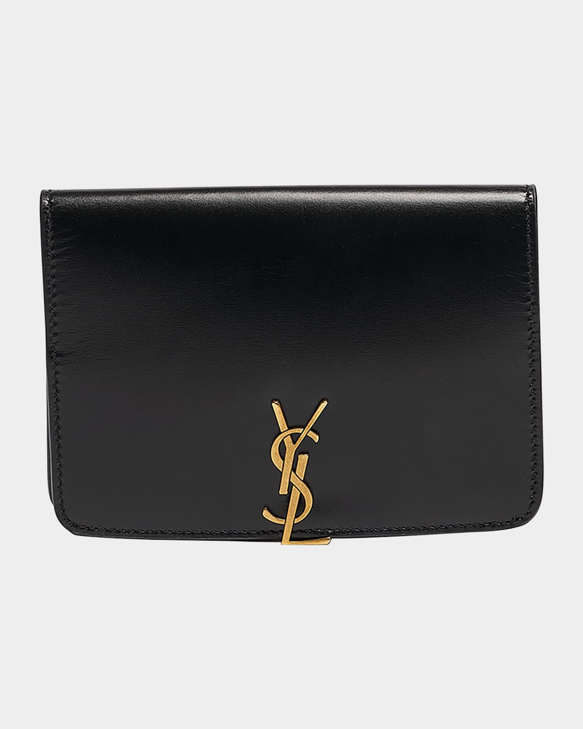 - Saint Laurent passport holder in leather - Features signature YSL logo letter - Flap top with clasp closure - Interior, two slip compartments, four card slots - Golden hardware - Approx. 5.3"H x 3.9"W x 0.7"D - Made in Italy