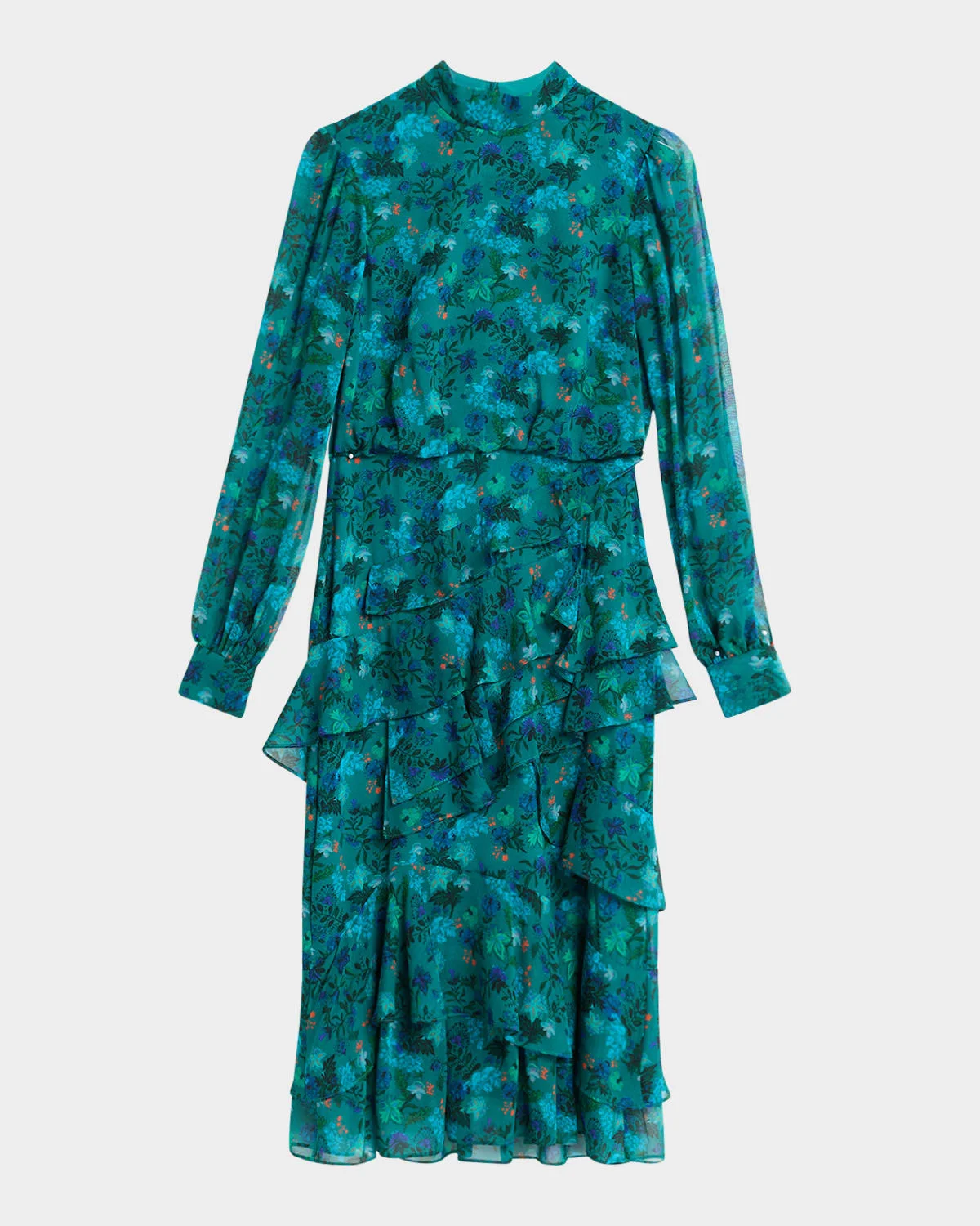 Saloni "Isa" floral-print silk dress with tiered, ruffled details.Mock turtleneck.Long sleeves.Slim silhouette.Hidden back zip.Flounce hem.Midi length.Imported.