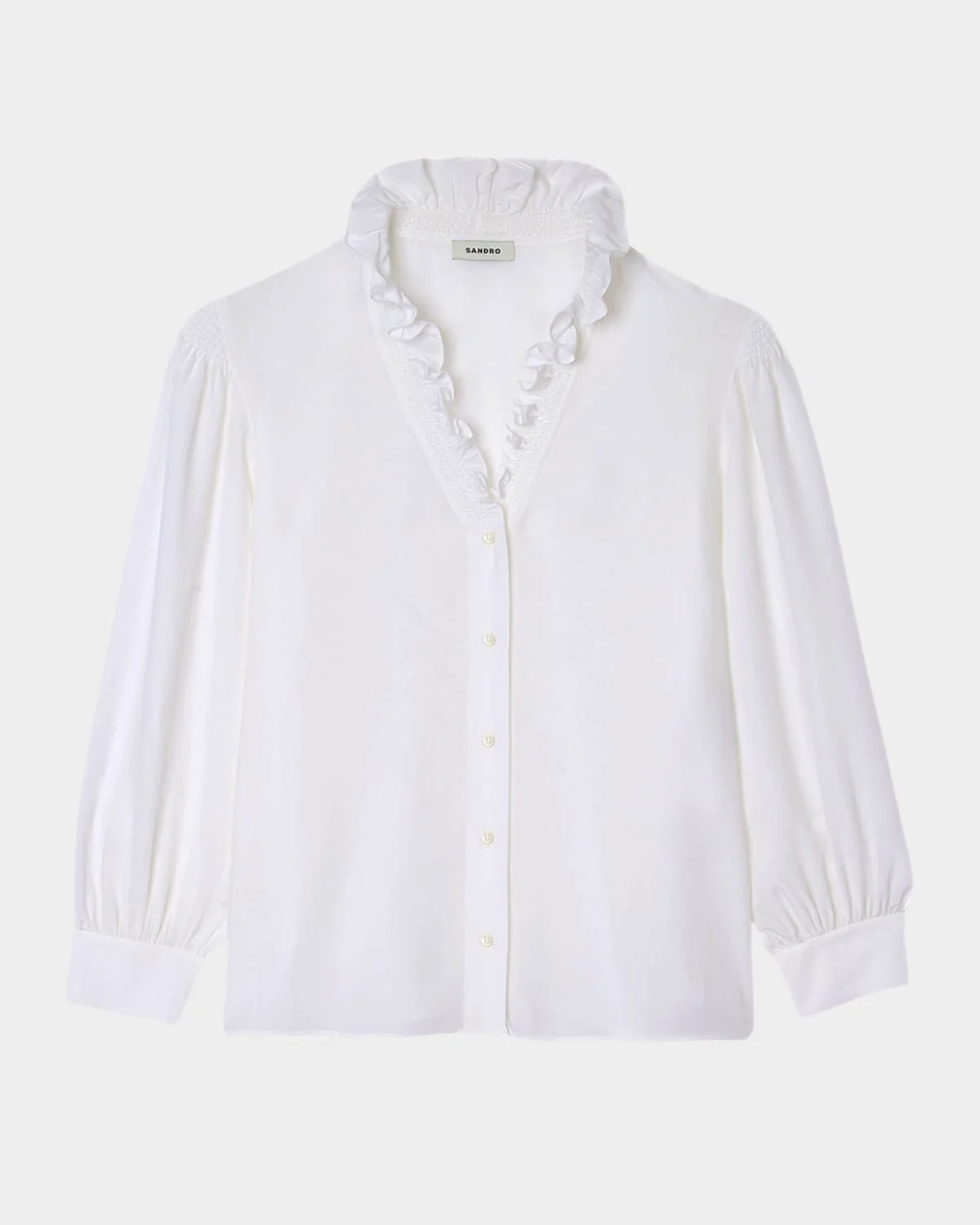 - Sandro "Lisandro" floaty silk shirt with smocked front detailing - Ruffled V neckline - Gathered shoulders - Long blouson sleeves; button cuffs - Hip length - Relaxed fit - Button front closure - Silk - Dry clean - Imported