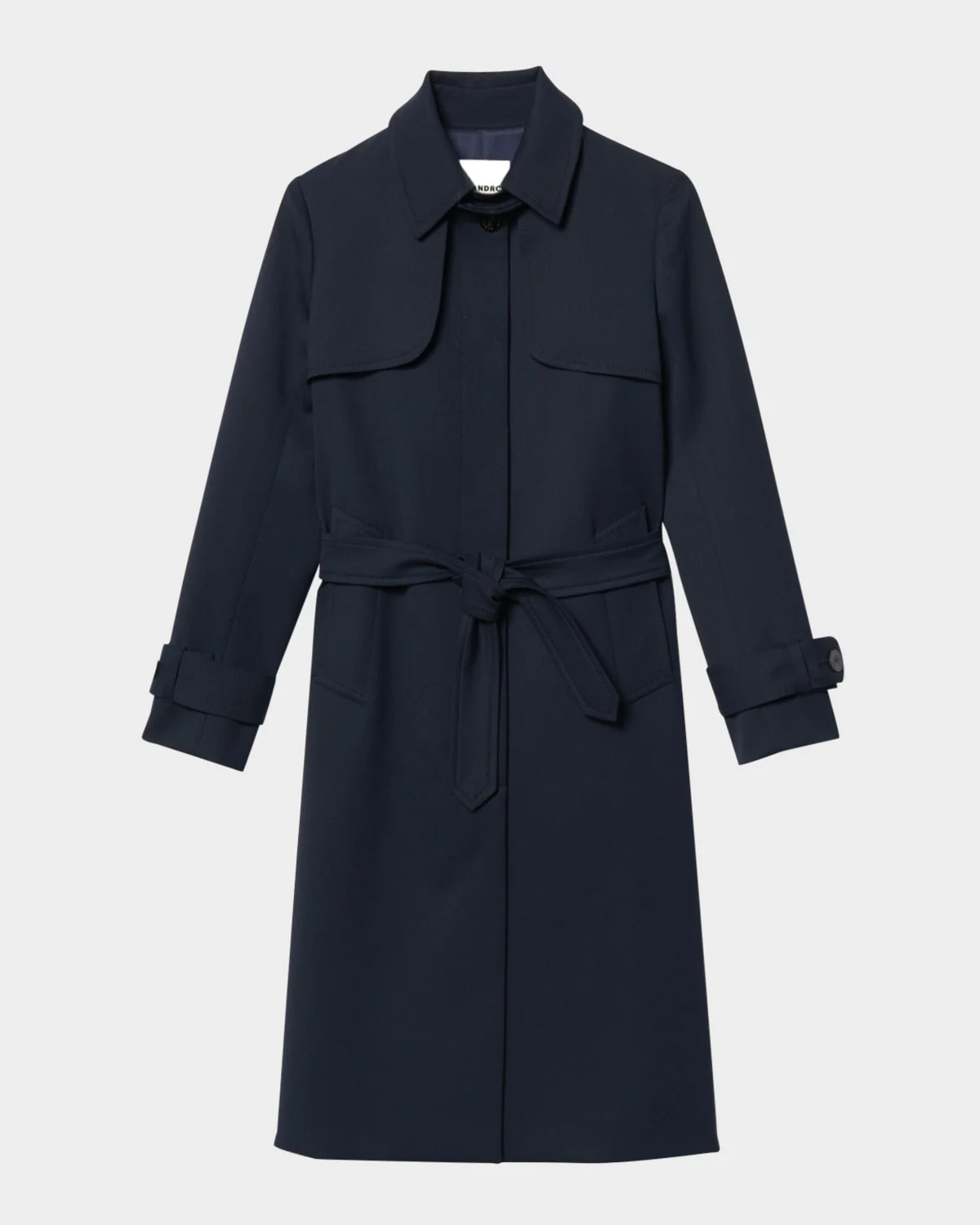 Sandro "Navy" trench coat with pleated inset at the back Spread collar; concealed placket Long sleeves; belted cuffs Tow slanted pockets Storm flap Belted waist Straight fit Polyester/wool/elastane Viscose lining Dry clean Imported