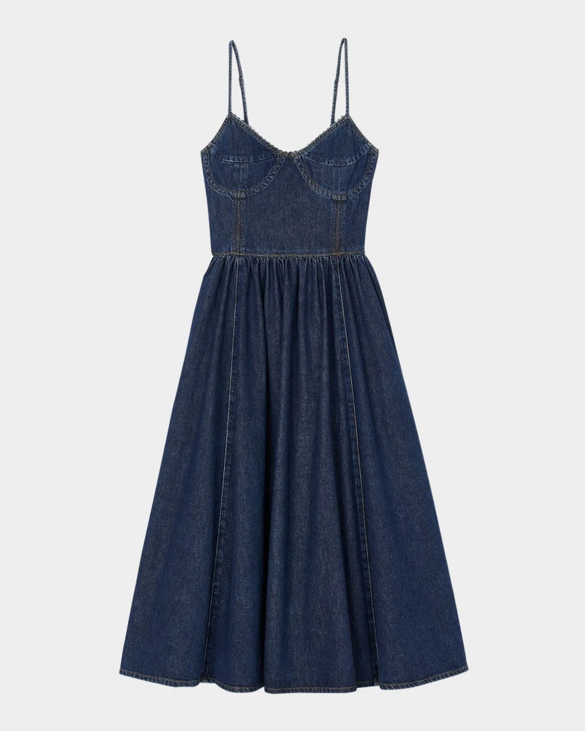 - Sandro "Sophie" dress in dark-wash denim features a structured corset-style bodice - Sweetheart neckline - Sleeveless - Hem falls below the knee - Full a-line skirt - Invisible back zipper - Cotton - Unlined - Machine wash cold - Imported