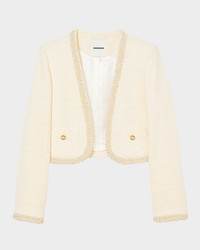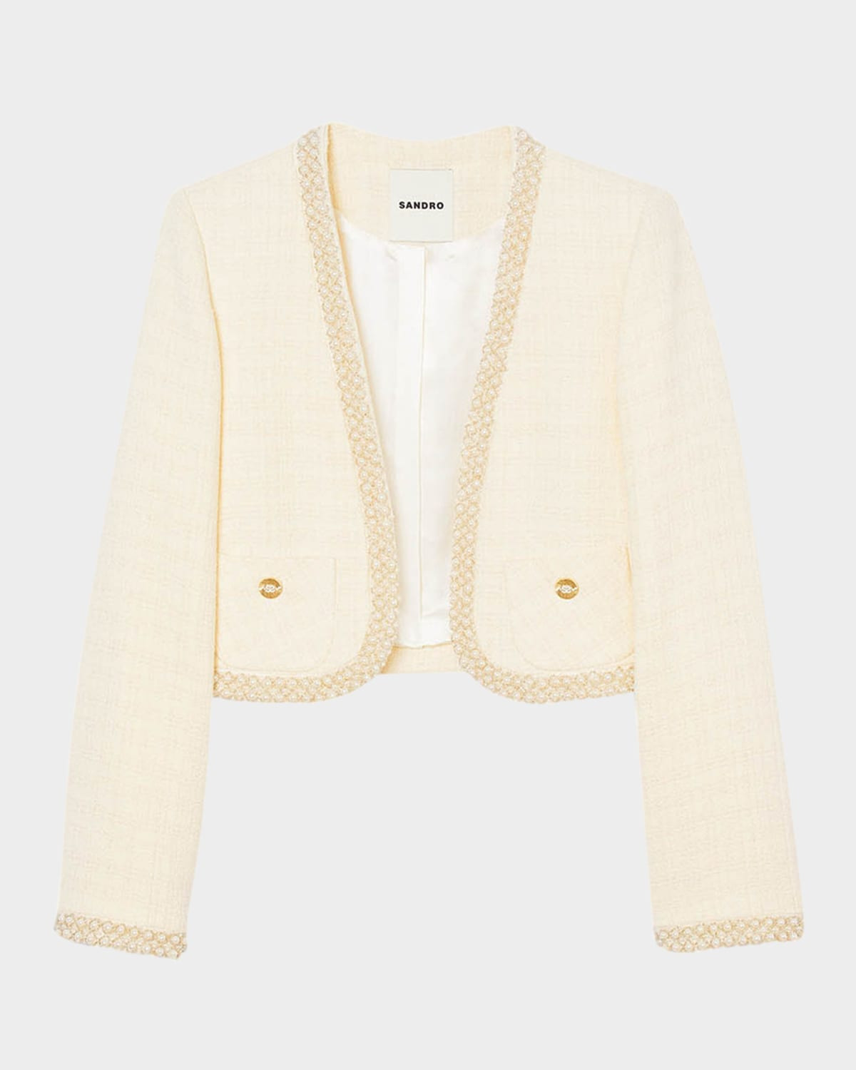 - Sandro "Vayene" tweed jacket with bead-embellished trim - Plunging V neckline - Long sleeves - Patch pockets - Fitted and structured cut - Cropped length - Cotton/viscose/acrylic - Viscose lining - Dry clean - Made in Bulgaria - Model is 5'10"/177cm.