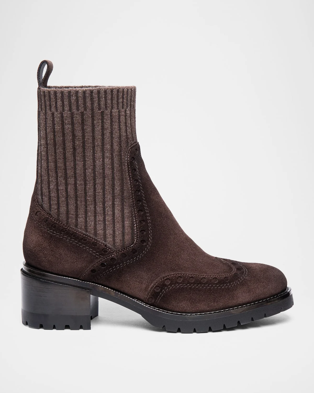 - Santoni "Ferret" brogue suede and knit fabric ankle booties - 2.00 in / 50 mm block heel - Round wing-tip toe - Knit sock collar - Pull-on style - Rubber outsole - Lining: Leather - Made in Italy