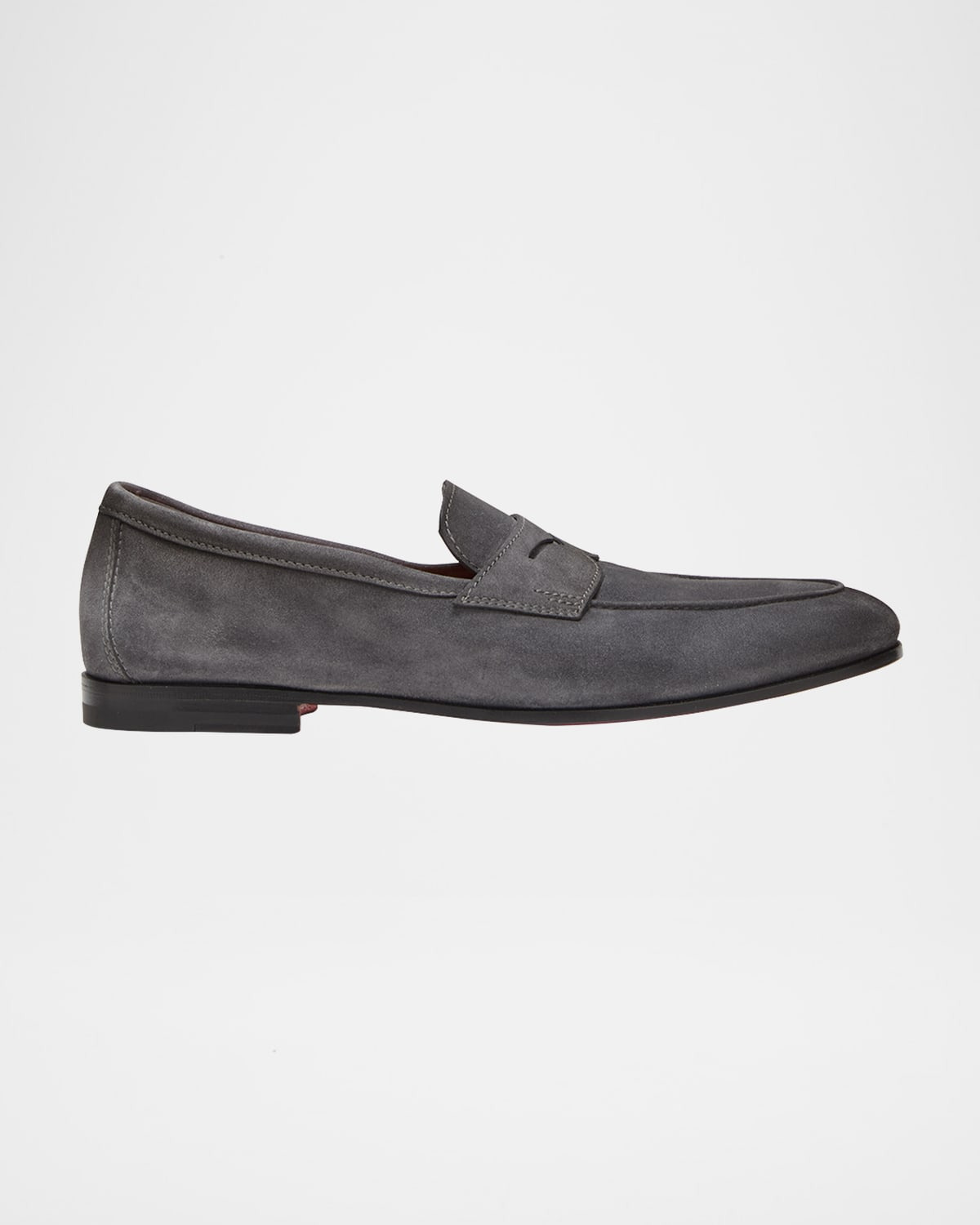 - Santoni "Carlos" penny loafers in suede - Stacked heel - Round apron toe - Penny keeper strap - Unlined - Slip-on style - Made in Italy