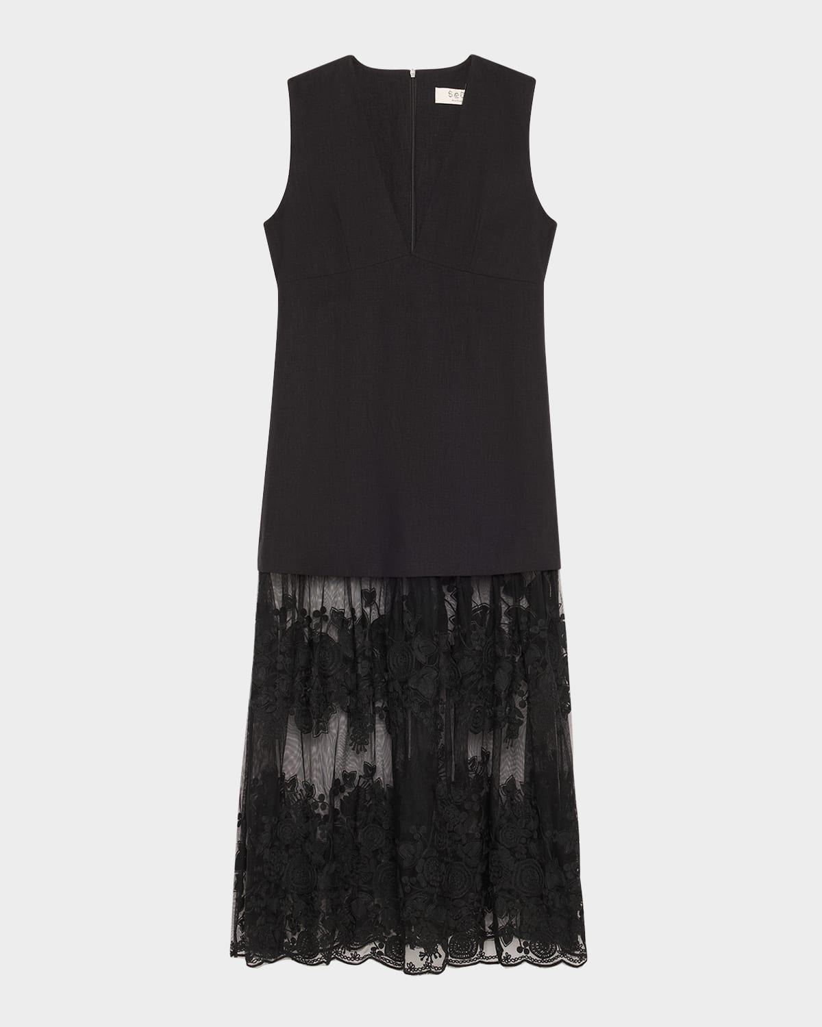 - Sea "Arielle" midi dress finished with lace hem - Plunging V neckline - Sleeveless - A-line silhouette - Hem falls below the knee - Center back zip - Cotton/linen/polyester - Dry clean - Imported