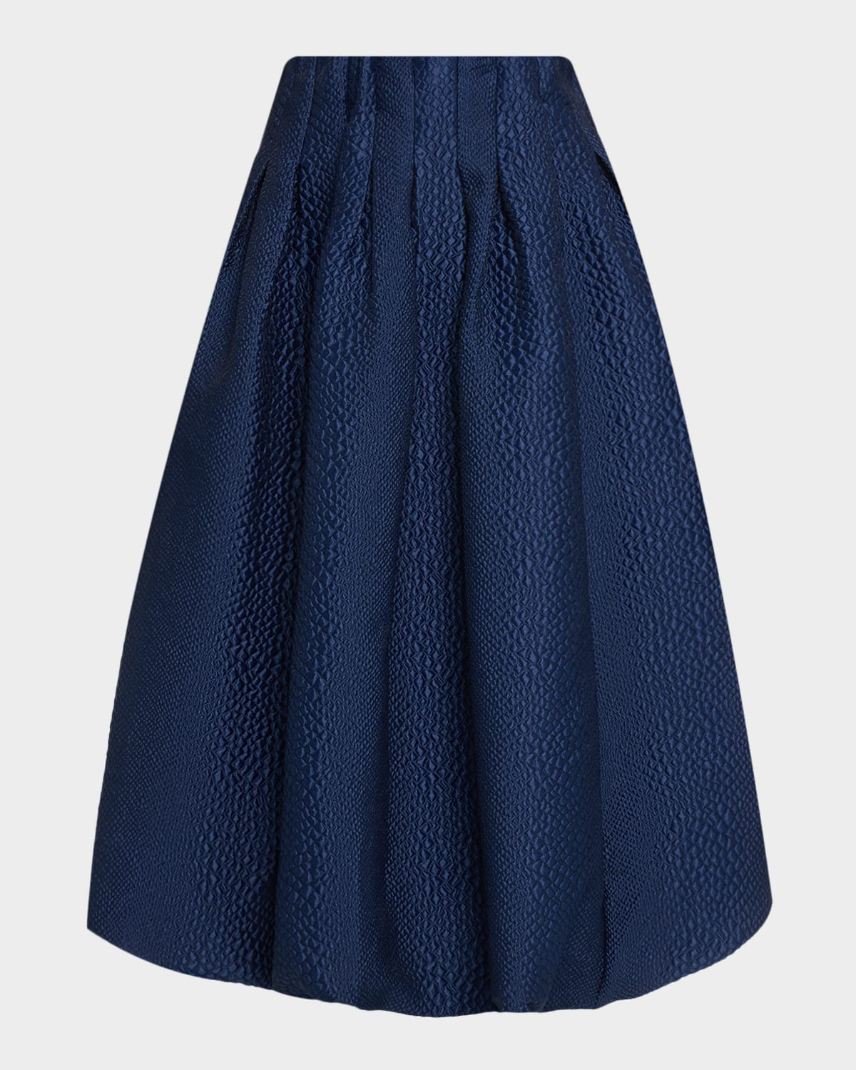 - Sea "Fayetta" embossed paneled midi skirt finished with a bubble hem and pleating - High rise - A-line silhouette - Hem falls below the knee - Zip closure - Polyester - Lining: Cotton - Dry clean - Imported