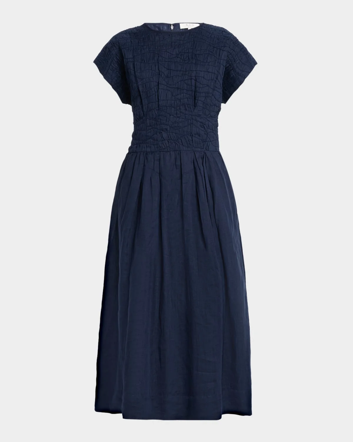 Sea's "Imogen" midlength dress features intricate pintuck detailing for textural interest Approx. 50"L from shoulder to hem Crew neckline Flared short sleeves Hem falls below the knee Aline skirt Invisible back zipper Ramie/cotton Lining: Cotton Dry clean Imported