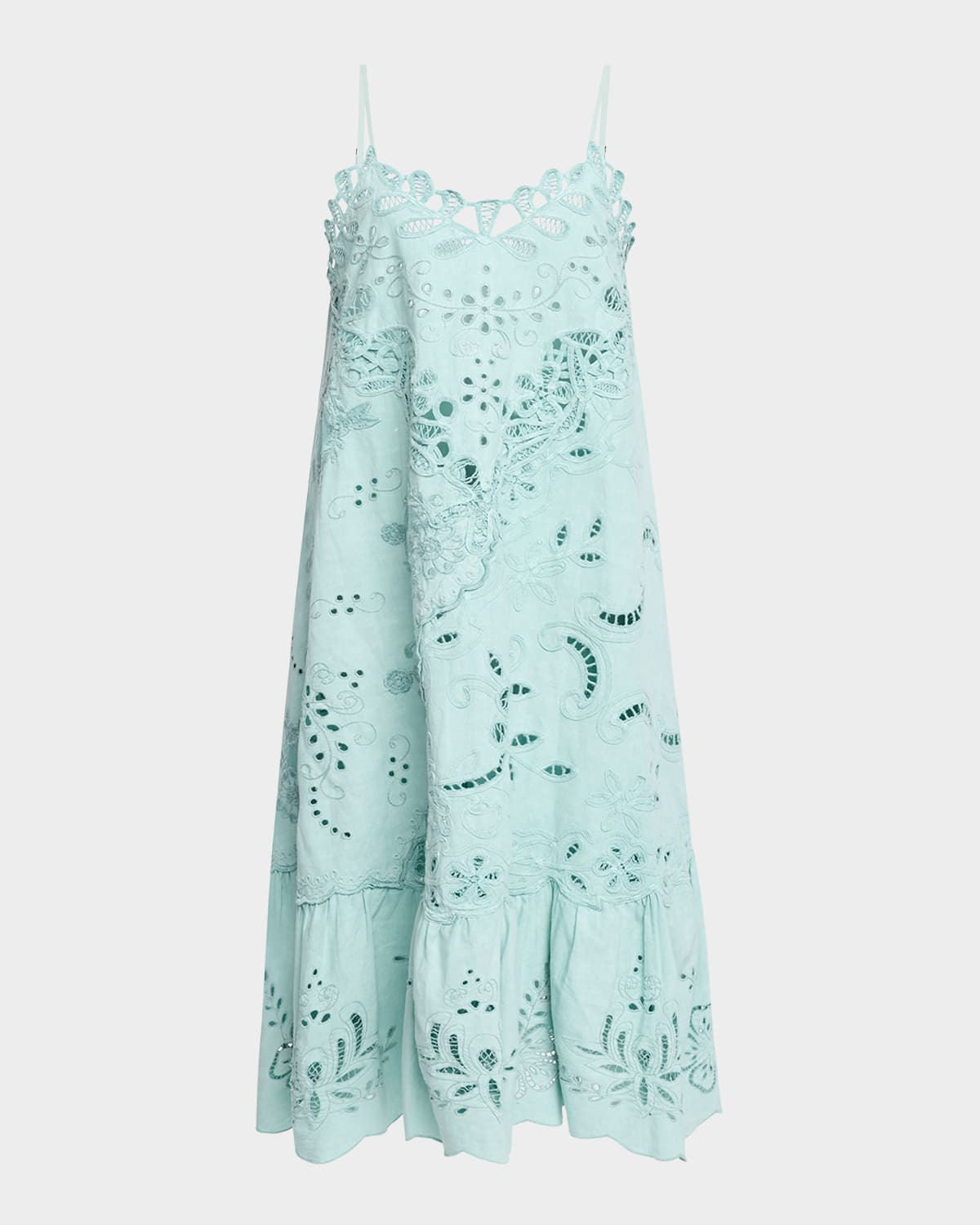 - Sea "Iyla" intricate soutache embroidered midi dress - V neckline - Adjustable spaghetti straps - Slip silhouette - Hem falls below the knee - Center back zip - Cotton/linen/polyester - Imported