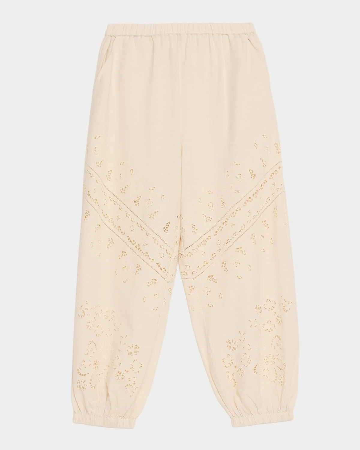 Crafted from a soft cotton and linen blend, the "Shanna" pants by Sea feature tonal lace throughout for a romantic touch. Approx. 12.8" rise; 27" inseam; 15.3" outseam Midrise; sits high on the hip Elastic waistband Side pockets Relaxed, looose fit Ankle length Pullon style Cotton/linen Dry clean Imported