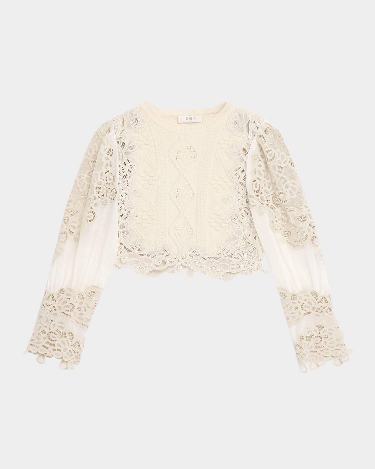 - Sea "Vania" combo sweater elevated with intricate lace embroidery - Crew neckline - Long puff sleeves; approx. 25"L - Classic fit - Hem sits at the hip - Pullover style - Wool/ramie/polyester - Dry clean - Imported