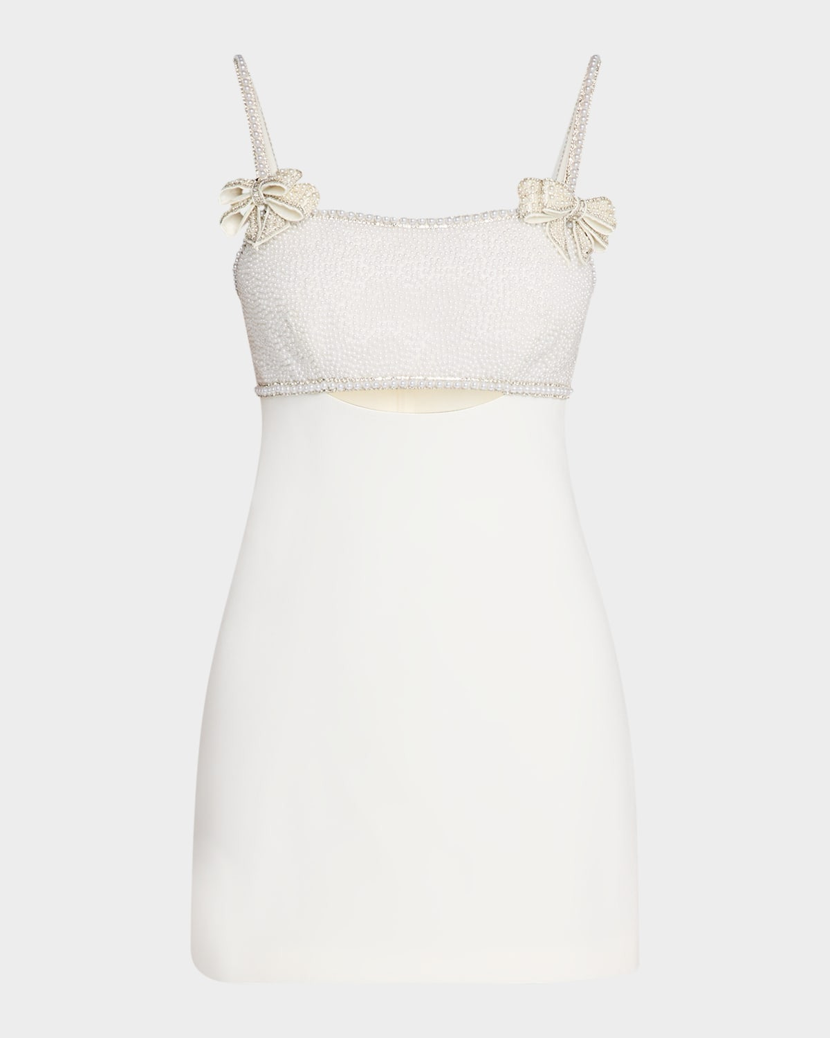 - Self-Portrait crepe mini dress in a sleek silhouette with faux pearl embroidery and bedazzled bow embellishments - Square neckline - Sleeveless - Underbust keyhole cutout - Hem falls above the knee - Body-skimming silhouette - Invisible back zipper - Polyester - Imported