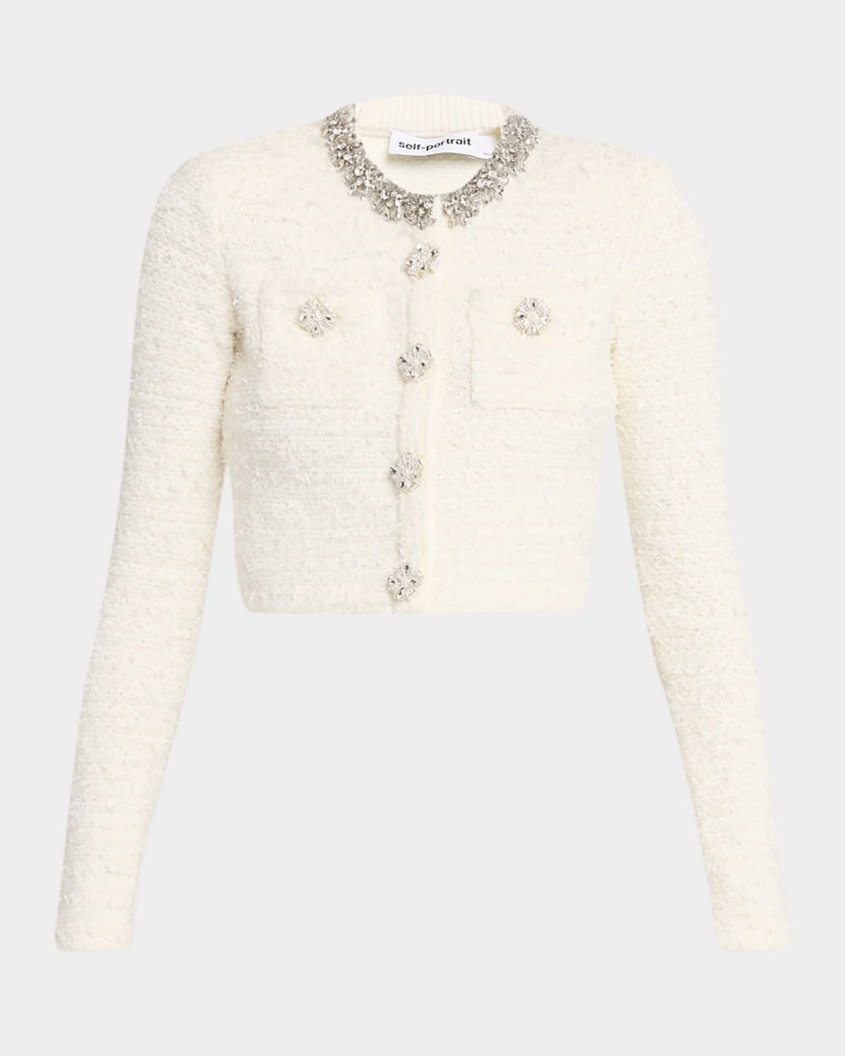 Adorned with faux diamante buttons and matching collar trim, this cardigan by SelfPortrait is knit from textured boucle Crew neckline Long sleeves Chest patch pockets Cropped hem Snap popper closure Cotton/polyester/wool Dry clean Imported