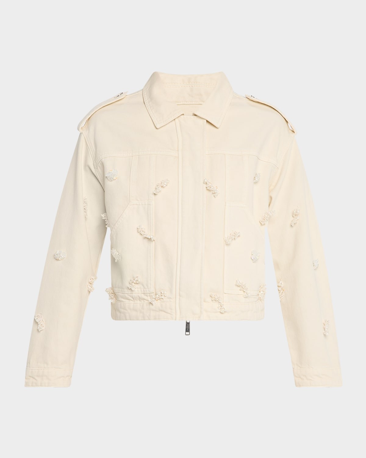 - Self-Portrait structured denim jacket embellished with floral appliques - Spread collar; concealed zip/snap placket - Shoulder epaulets - Long sleeves; button cuffs - Front patch pockets - Yoked back - Relaxed fit - Hip length - Cotton - Imported