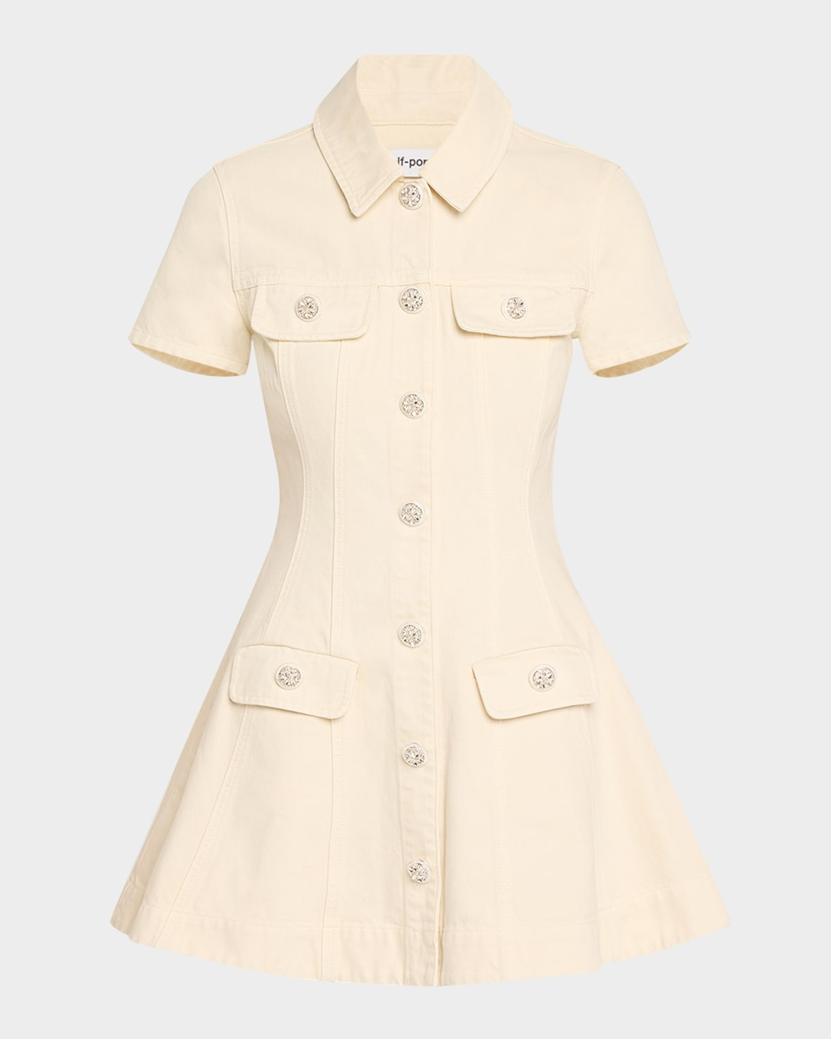 - Self-Portrait structured denim dress accented with glittering daux diamante buttons - Shirt collar; snap and popper front closure - Short sleeves - Functional flap pockets - Hem falls above the knee - A-line silhouette - Cotton - Lining: Cotton - Dry clean - Imported