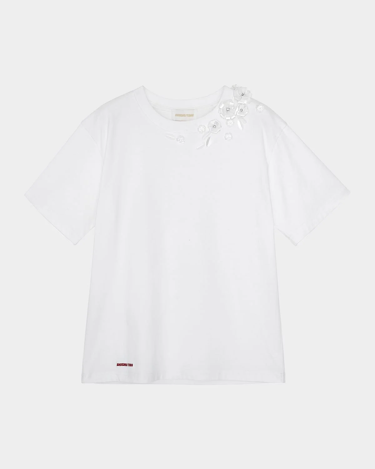 - SHUSHU/TONG floral beaded cotton t-shirt - Crew neckline - Short sleeves; approx. 8.3"L - Easy fit - Hem falls to the hip - Pullover style - Cotton - Trim: Beading - Dry clean or hand wash - Imported