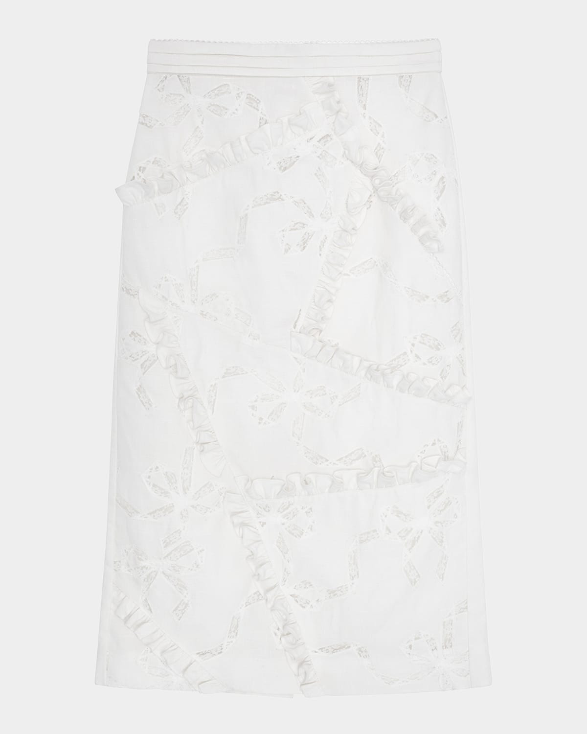 - SHUSHU/TONG skirt featuring lace bow patchwork - High rise - Skirt falls straight from hip to hem - Hem hits around the knee - Zip closure - Wool/linen - Lining: Nylon - Trim: Lace - Dry clean - Imported