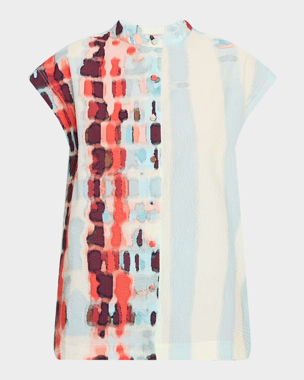 - Silvia Tcherassi "Adele" textured blouse featuring an abstract print - Band collar; button front - Cap sleeves - Relaxed fit - Shirttail hem - Cotton/elastane - Made in Colombia