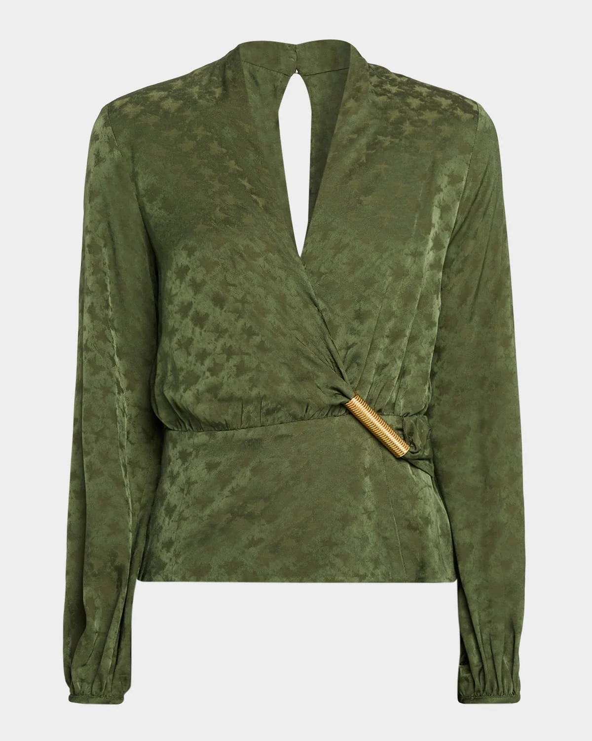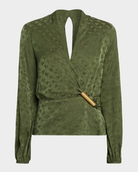 A sophisticated statement in motion, the Silvia Tcherassi "Elvie" blouse is crafted from lustrous satin, featuring draped asymmetry embellished with a spiral ring framing the torso with effortless drama. Surplice neckline; button/keyhole back Long blouson sleeves Slim fit Back zip Viscose Made in Italy