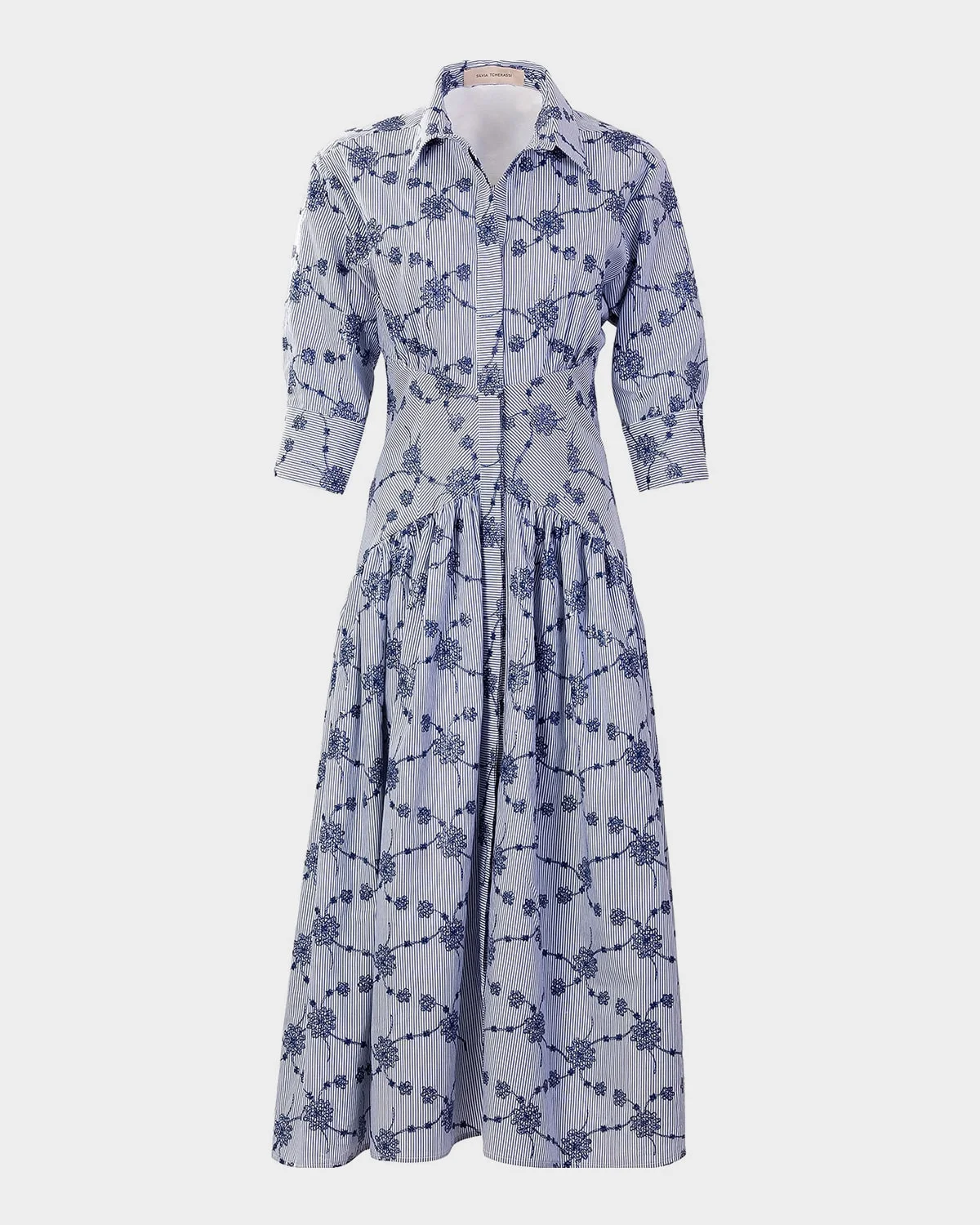 Crafted from floral embroidered striped cotton, the "Indy" shirtdress from Silvia Tcherassi features a gathered waist panel creating a flowy & nbsp;skirt Point collar; concealed button front 3/4-sleeves; button cuffs Fit-and-flare silhouette Hem falls below the knee Cotton/polyurethane/polyester Dry clean Made in Colombia