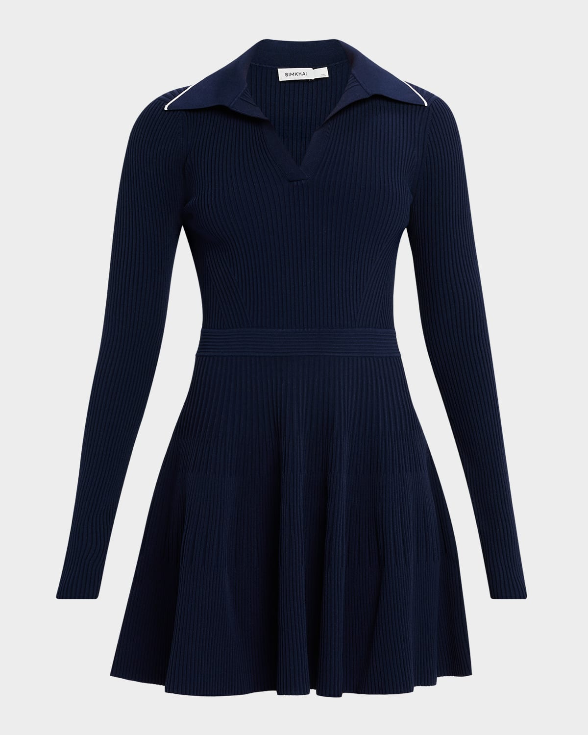 SIMKHAI "Alcott" dress in compact ribknit with a sporty striped polo collar and a banded waist, combining casual sensibility with flattering structure Polo collar Long sleeves Bandinset waist contours shape Fitandflare silhouette Hem falls above the knee Slipover style Rayon Dry clean only Imported