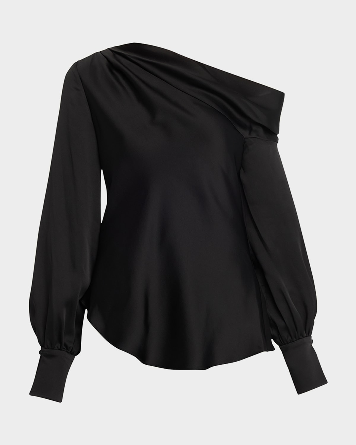 - SIMKHAI "Alice" high-sheen satin blouse draped with a cold shoulder - One-shoulder neckline - Long sleeves; button cuffs - Relaxed fit - Pullover style - Acetate/polyurethane - Dry clean - Imported - Size Note: Item runs large, consider ordering a size down. - Model height: 5'10"/177cm.