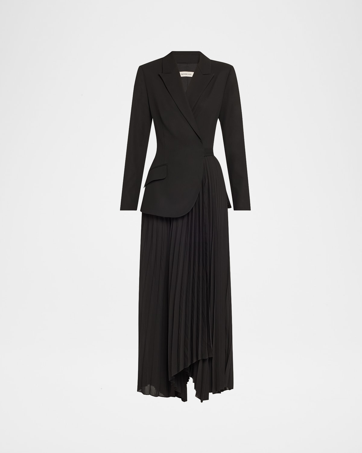 - SIMKHAI "Ambretta" combo blazer dress finished with pleating - Peak lapels; V neckline - Long sleeves with button cuffs - Hip flap pockets - Wrap silhouette - Hem falls above the knee - Side closure - Acetate/polyester - Lining: Polyester - Dry clean - Imported