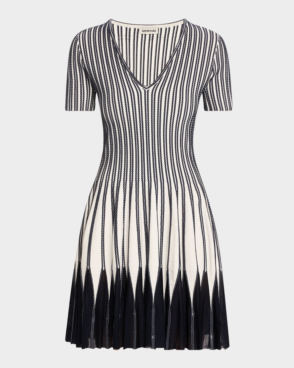 - SIMKHAI "Beckett" striped compact knit mini dress - V neckline - Sleeveless - Structured, A-line silhouette - Hem falls above the knee - Slipover style - Rayon/cellulose acetate/nylon/polyamide/polyester - Dry clean only - Imported