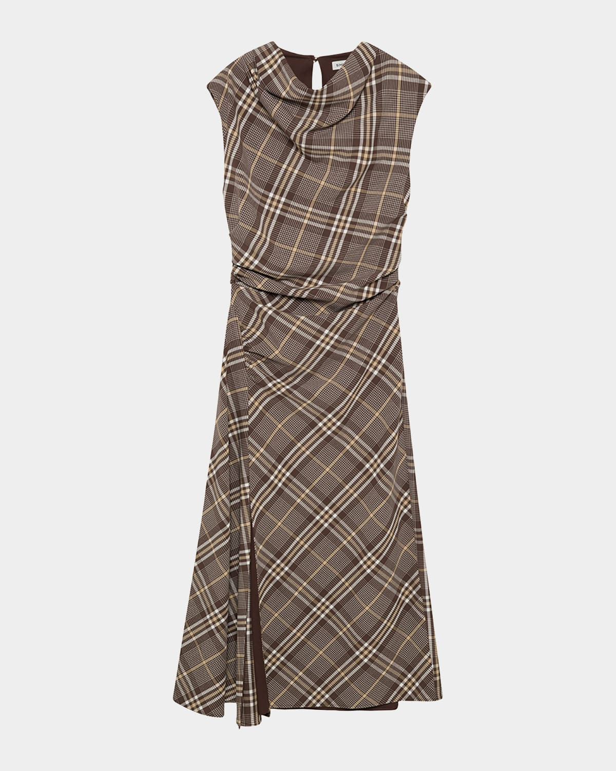 SIMKHAI "Burke" plaidprint midi dress finished with figureflattering draping throughout High neckline Sleeveless Draped silhouette Thighhigh side slit Hem falls below the knee Back keyhole closure Viscose/elastane Dry clean Imported