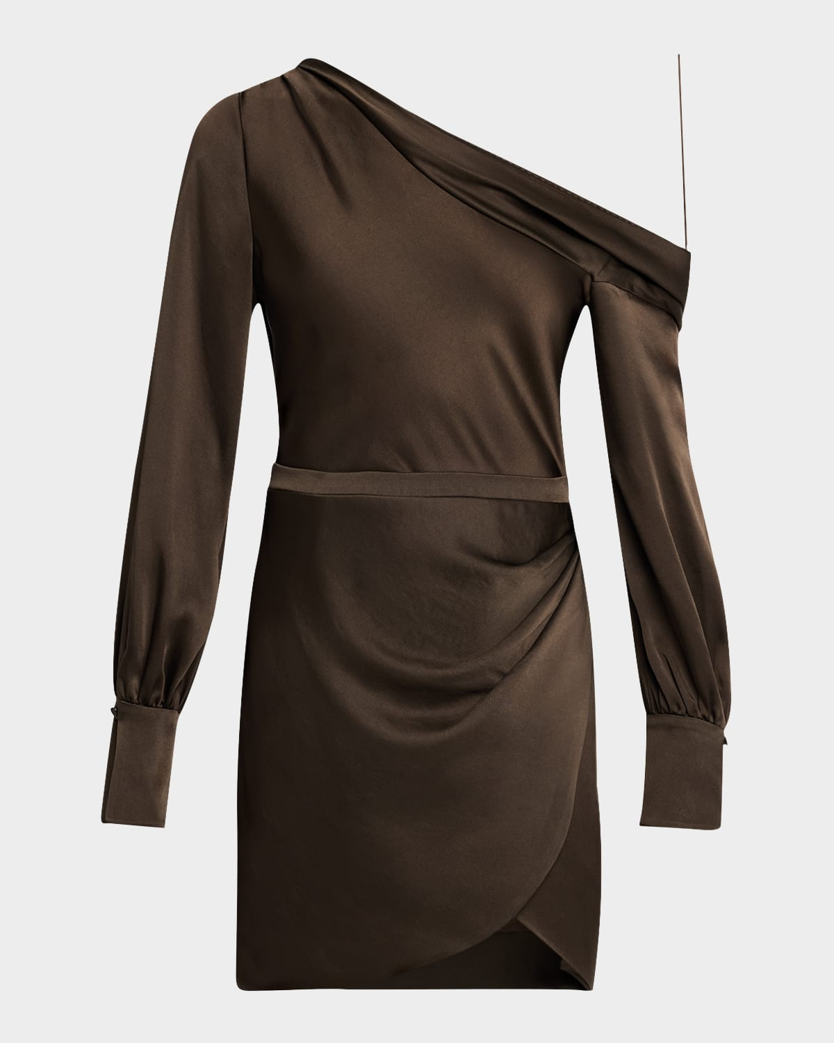 SIMKHAI "Cameron" satin mini dress featuring a oneshoulder neckline Long sleeves with button cuffs Draped silhouette Hem falls above the knee Side zip Acetate/polyester Dry clean Made in USA