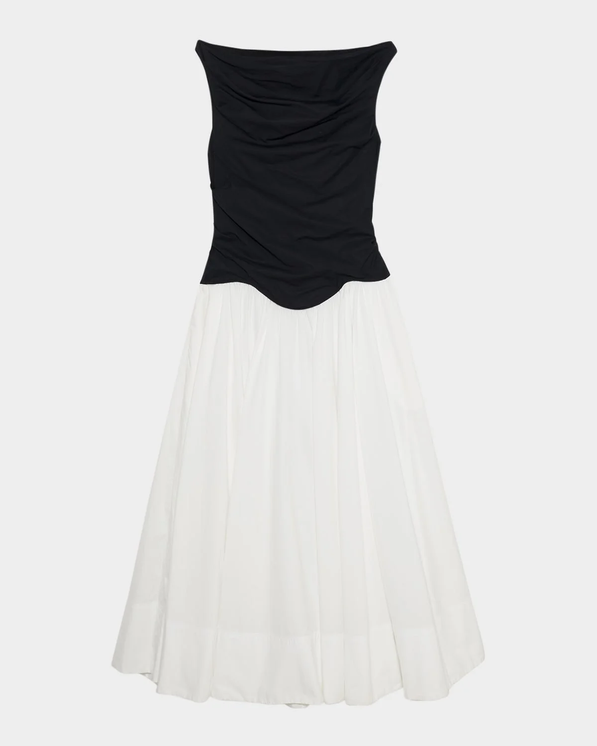 - SIMKHAI "Cersei" midi dress featuring a draped off-the-shoulder bodice - Sleeveless - Drop-waist silhouette - Hem falls below the knee - Side zip - Cotton/polyester - Dry clean - Imported