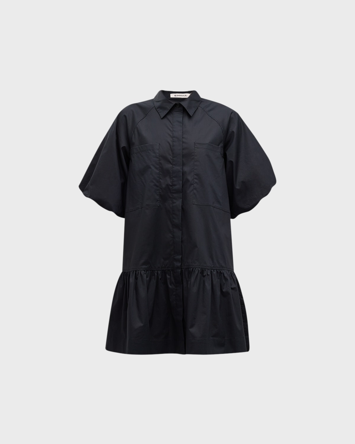 - Jonathan Simkhai Standard "Chrissy" poplin dress finished with a ruffle hem - Point collar; hidden button-front placket - Elbow puff sleeves - Raglan seams - Oversized patch pockets - Hem hits above the knee - A-line silhouette - Cotton - Imported - Model is 5'10"/177cm.